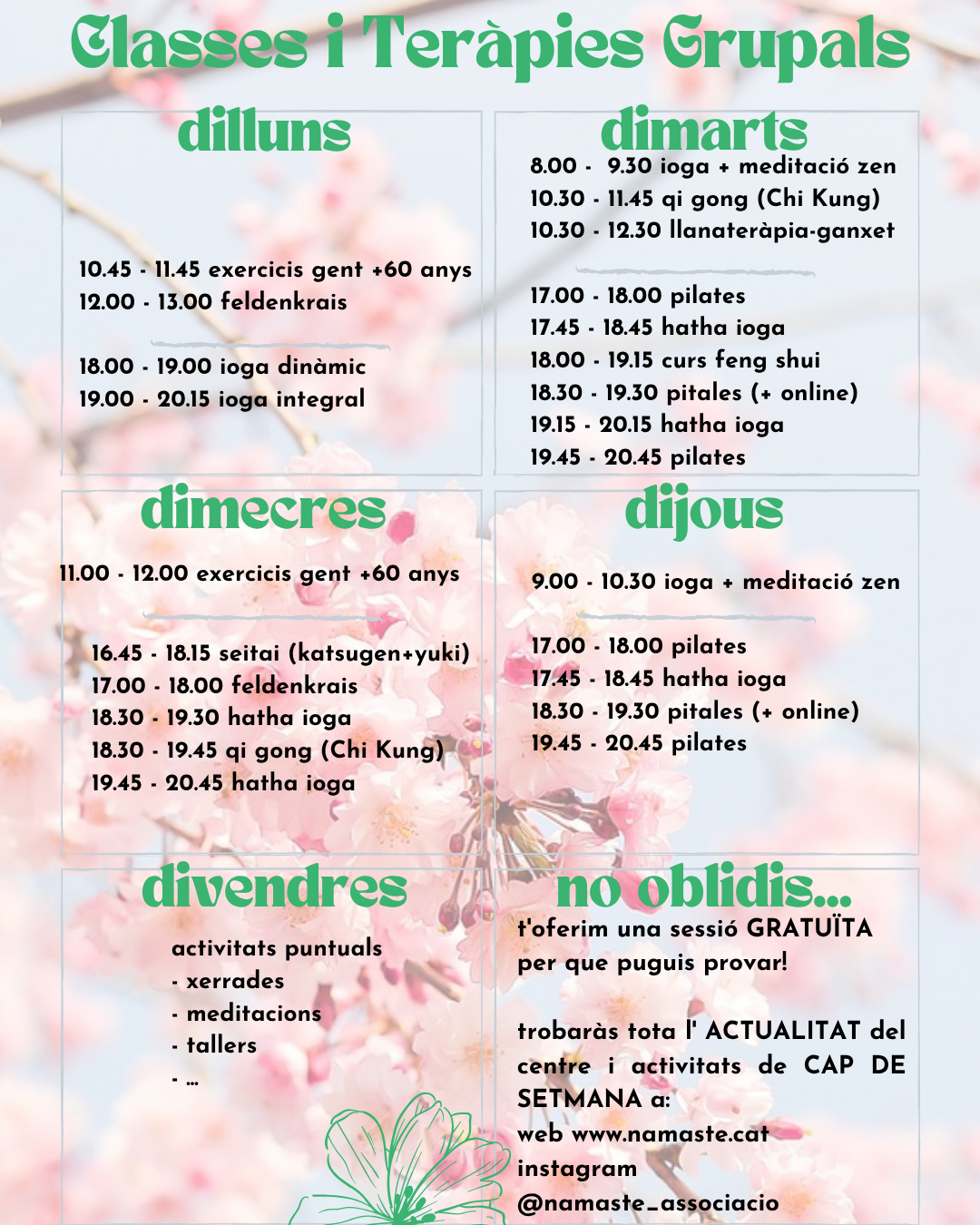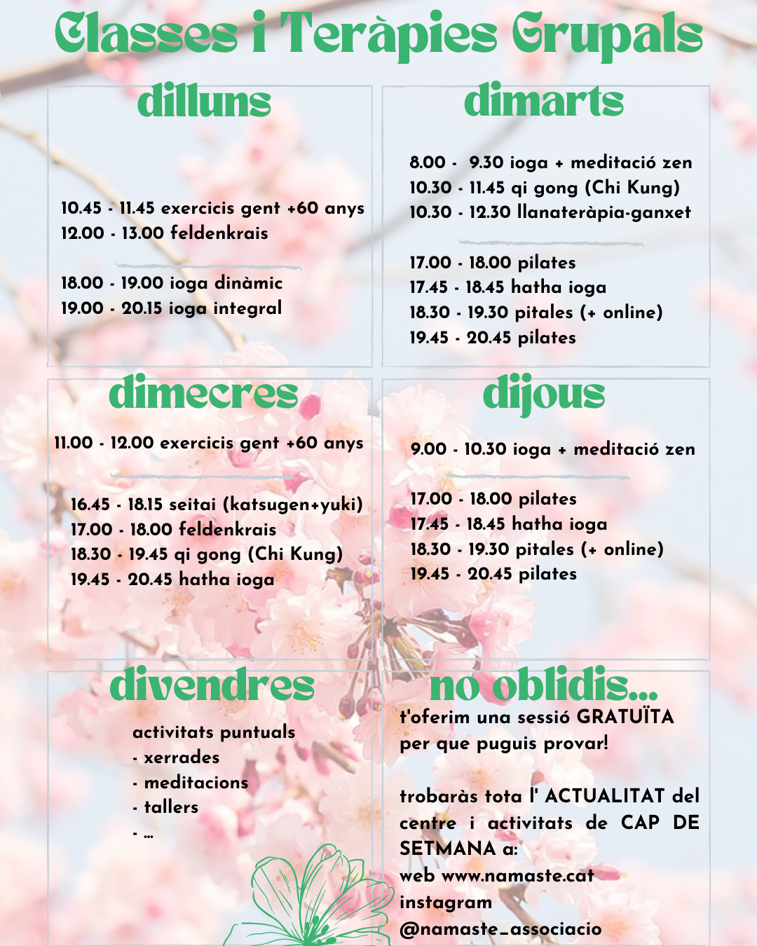 Les classes regulars són classes o cursos grupals que es realitzen de menera periòdica a l’Associació Namasté (C/Varsòvia, 52 – 08041 Barcelona). Per poder conèixer realment què ens ofereix cada taller, us oferim UNA SESSIÓ GRATUÏTA de qualsevol curs per a que les pugueu provar, i no hi ha despeses d’inscripció ni matrícula. Si us interessa alguna classe, poseu-vos en contacte amb nosaltres al 93 436 56 71 o info@namaste.cat. Us recordem que en cap cas pretenem substituir cap tractament mèdic convencional. Comproveu els horaris a sota, a la descripció de les activitats, o contactant-nos directament: